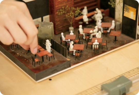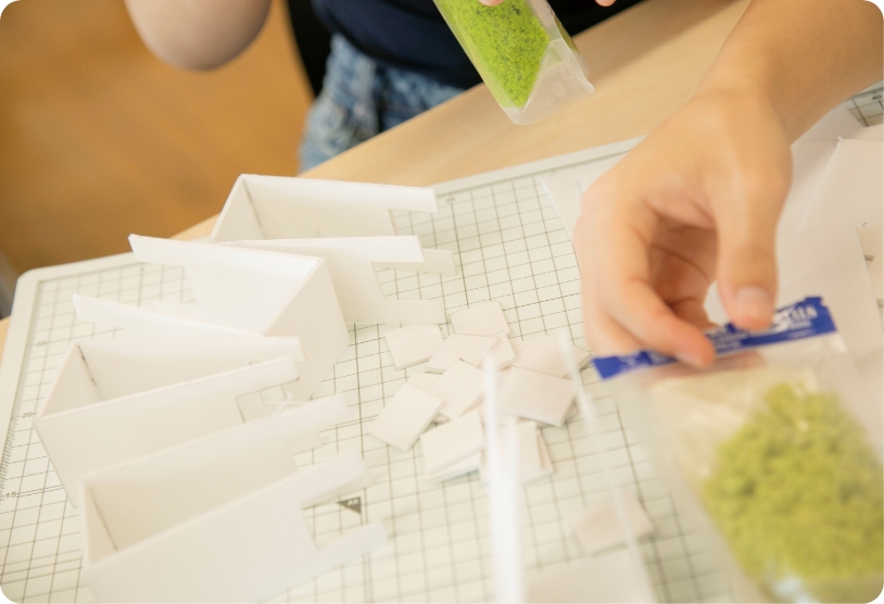 - リノベーション演習では既存の空間を新しい視点で再設計します。人々が集まりくつろぐカフェをテーマに、模型制作を通して空間の変化を“見える化”。発想力と提案力を磨きます。