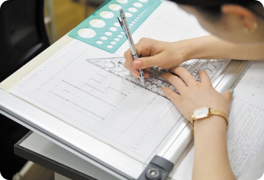- インテリア製図では、椅子や机といった家具の寸法や配置を学びながら、図面の基本ルールを一つひとつ習得していきます。空間づくりの基礎を丁寧に身につける授業です。